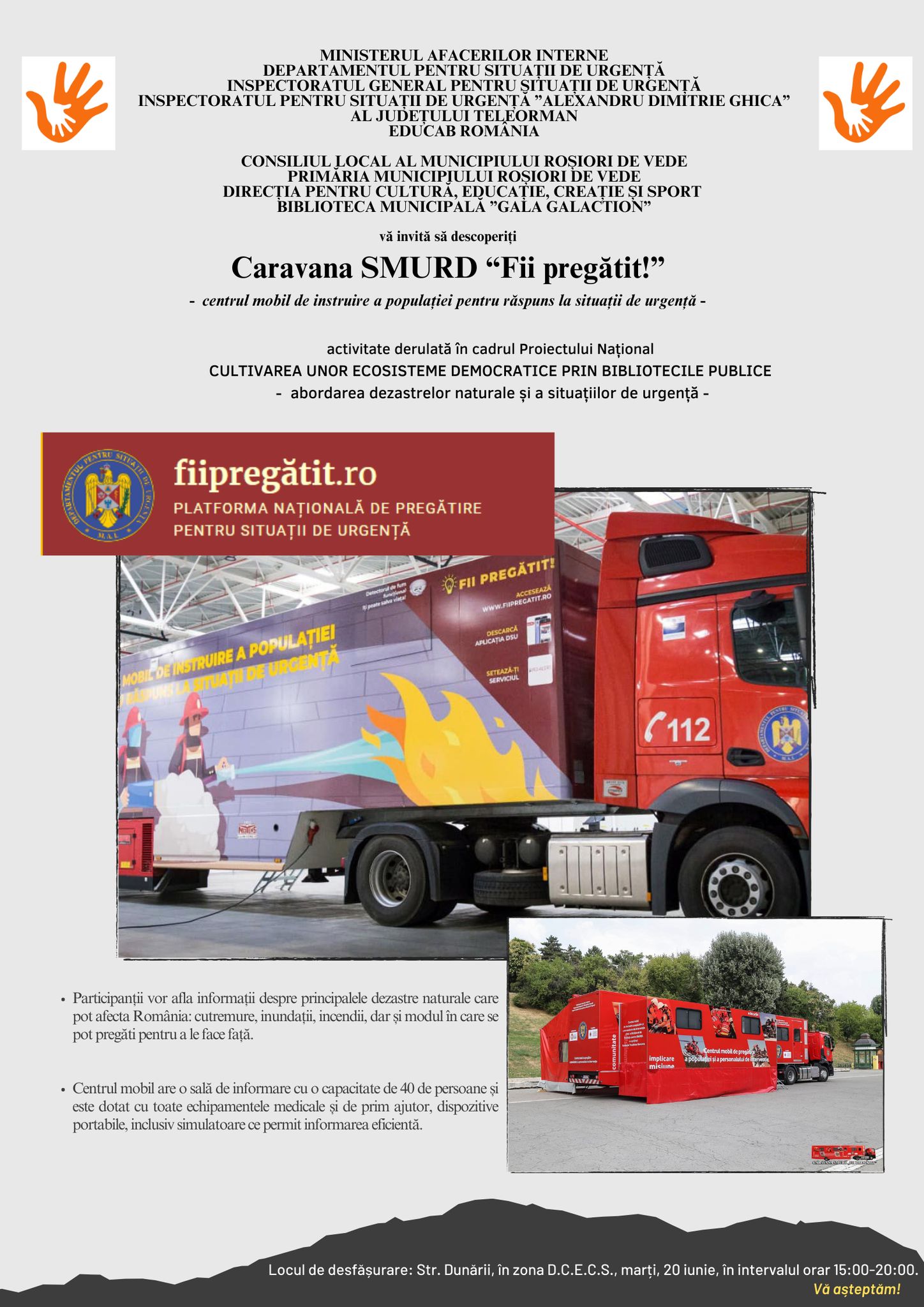 Caravana SMURD „Fii pregătit” și Centrul mobil de instruire a populației pentru răspuns la situații de urgență vor fi prezente, în perioada 19-22 iunie, în 7 localități din județul Teleorman (Alexandria, Roșiori de Vede, Buzescu, Drăgănești de Vede, Măldăeni, Peretu și Plosca).