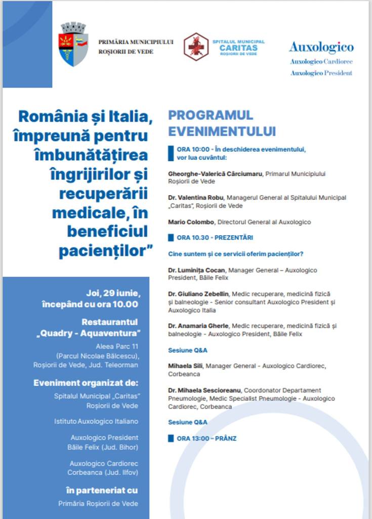 Spitalul Municipal „Caritas” și Institutul Auxologico din Milano, în parteneriat cu Primăria Municipiului Roșiori de Vede, au organizat joi, 29 iunie 2023, de la ora 10.00, simpozionul „România și Italia, împreună pentru îmbunătățirea îngrijirilor și recuperării medicale, în beneficiul pacienților”.