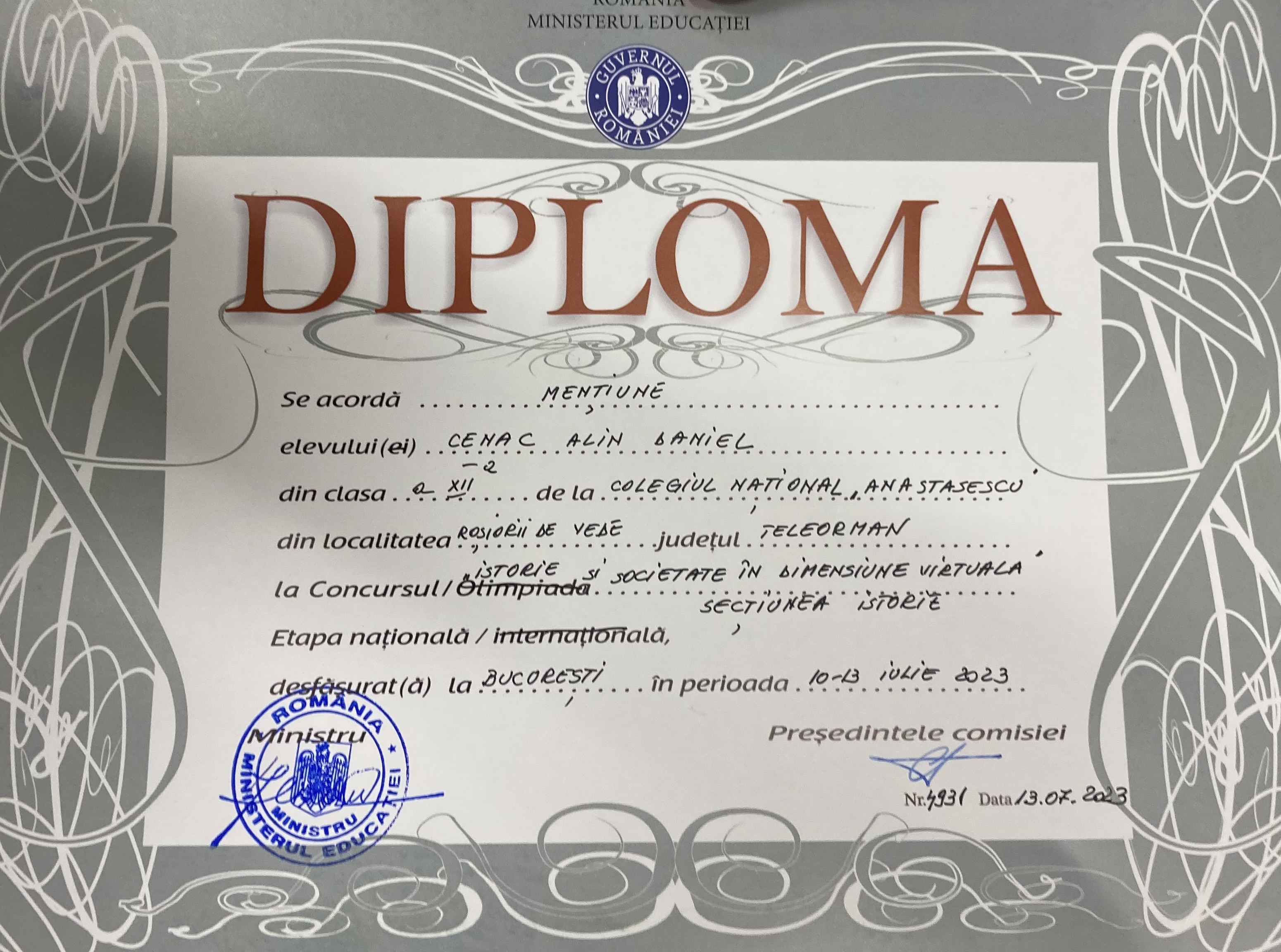 Elevul Colegiului Național ,,Anastasescu” din Roșiori de Vede, Daniel Alim Cenac, din clasa a XII-a, a obținut mențiune la Concursul National Istorie și Societate în Dimensiune Virtuală, Secțiunea Istorie desfășurat la București.