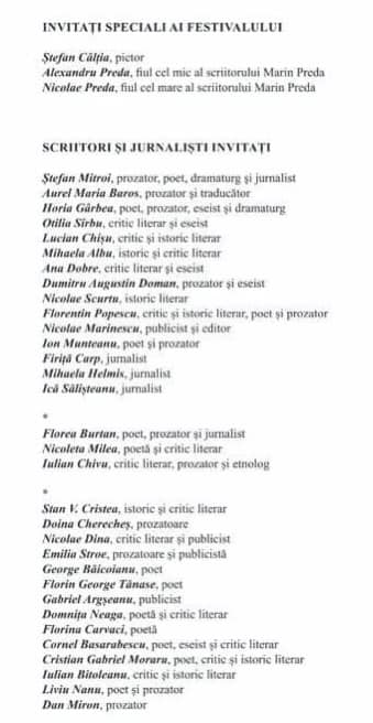 Colocviul „Marin Preda- contemporanul nostru” a fost moderat de scriitorul Ștefan Mitroi. Au susținut prelegeri: Lucian Chișu, critic și istoric literar, director interimar al Institutului de Istorie și Teorie Literară „George Călinescu” al Academiei Române, Otilia Sîrbu, critic literar, eseistă, secretar științific al Secției de Filologie și Literatură a Academiei Române, Ana Dobre, critic și istoric literar, Dumitru Augustin Doman, prozator și eseist, Nicolae Scurtu, istoric literar. Un moment inedit l-a reprezentat participarea renumitului pictor Ștefan Câlția, care, din motive obiective nu a putut ajunge, ținând să fie prezent prin intermediul unei înregistrări a dialogului telefonic dintre artist și directorul festivalului.