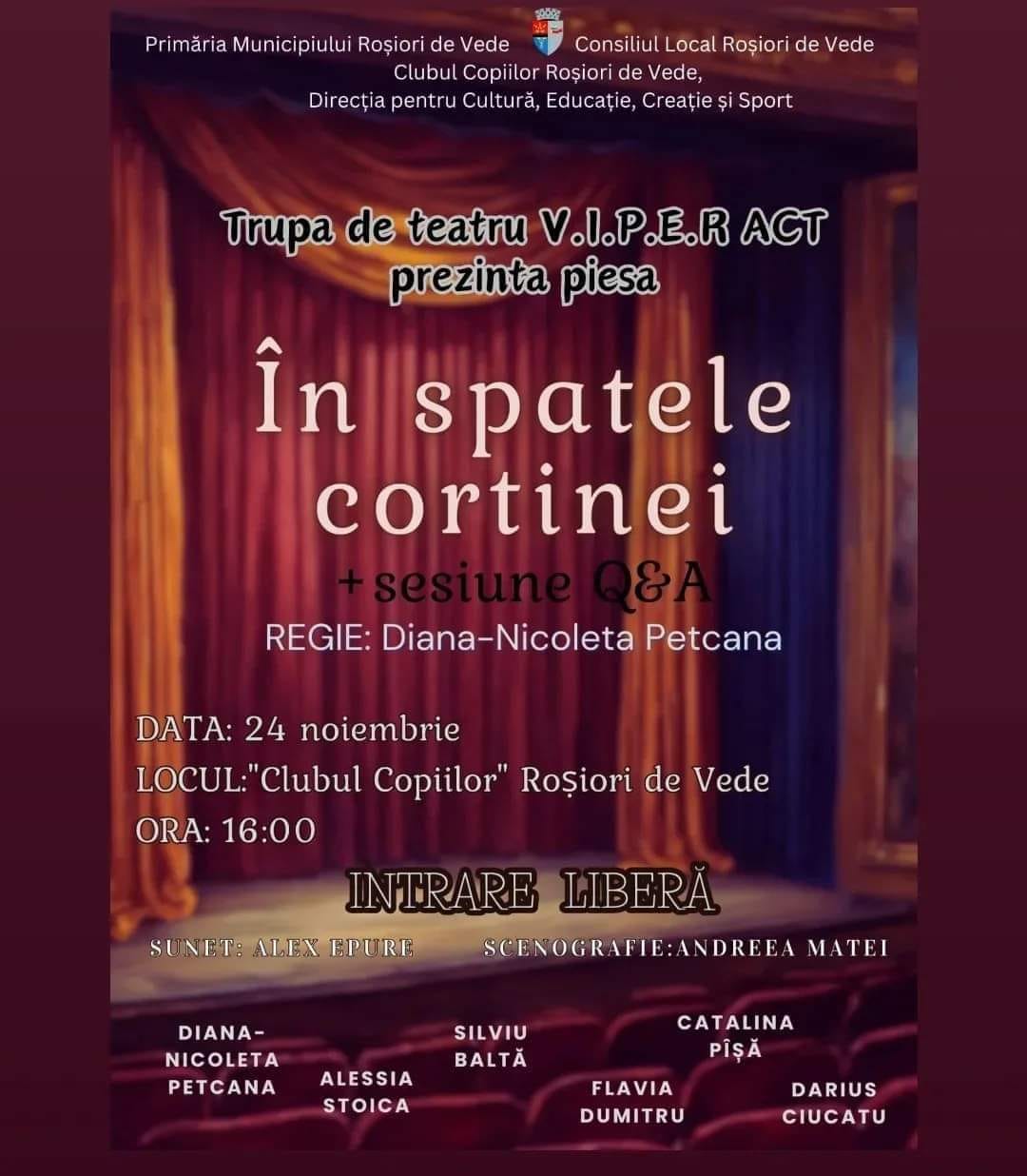 Trupa V.I.P.E.R. ACT din orașul Roșiori de Vede a reușit să atragă aplauzele publicului de la prima reprezentație. Piesa „În spatele cortinei” a scos în evidență talentul unor adolescenți care doresc să li se legitimeze identitatea în zona artistică a orașului.