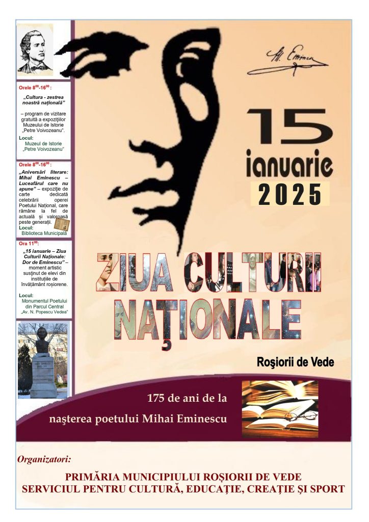 Anul 2025 a fost declarat „Anul Mihai Eminescu”, dedicat demersului de promovare a valorilor culturale, și este ocazia ideală de a celebra opera și moștenirea acestui mare poet. Evenimentele organizate de Primăria Municipiului Roșiorii de Vede vor include momente artistice inspirate din opera eminesciană la bustul poetului din Parcul Central „Avocat Nicolae Popescu – Vedea”, precum și o expoziție de carte dedicată acestui mare creator, organizată la Biblioteca Municipală „Gala Galaction”. De asemenea, roșiorenii vor avea oportunitatea de a vizita gratuit expozițiile permanente ale Muzeului Municipal „Petre Voivozeanu”, pentru a se apropia mai mult de cultura și istoria noastră.