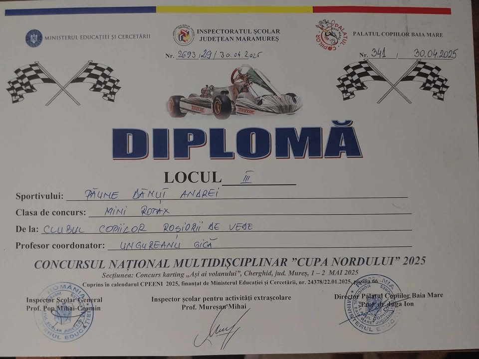 Târgu Mureș, 2025 – În perioada 30 Aprilie – 02 Mai, pista Motor Ring din localitatea Cerghid, județul Mureș, a găzduit două competiții importante din calendarul sportiv național: Concursul Național „Cupa Nordului” și Concursul Interjudețean „Cupa Carașului”. Printre participanții care au demonstrat talent și determinare s-a numărat și Clubul Copiilor Roșiorii de Vede, ale cărui rezultate au fost deosebite sub îndrumarea atentă a domnului profesor Gică Ungureanu.