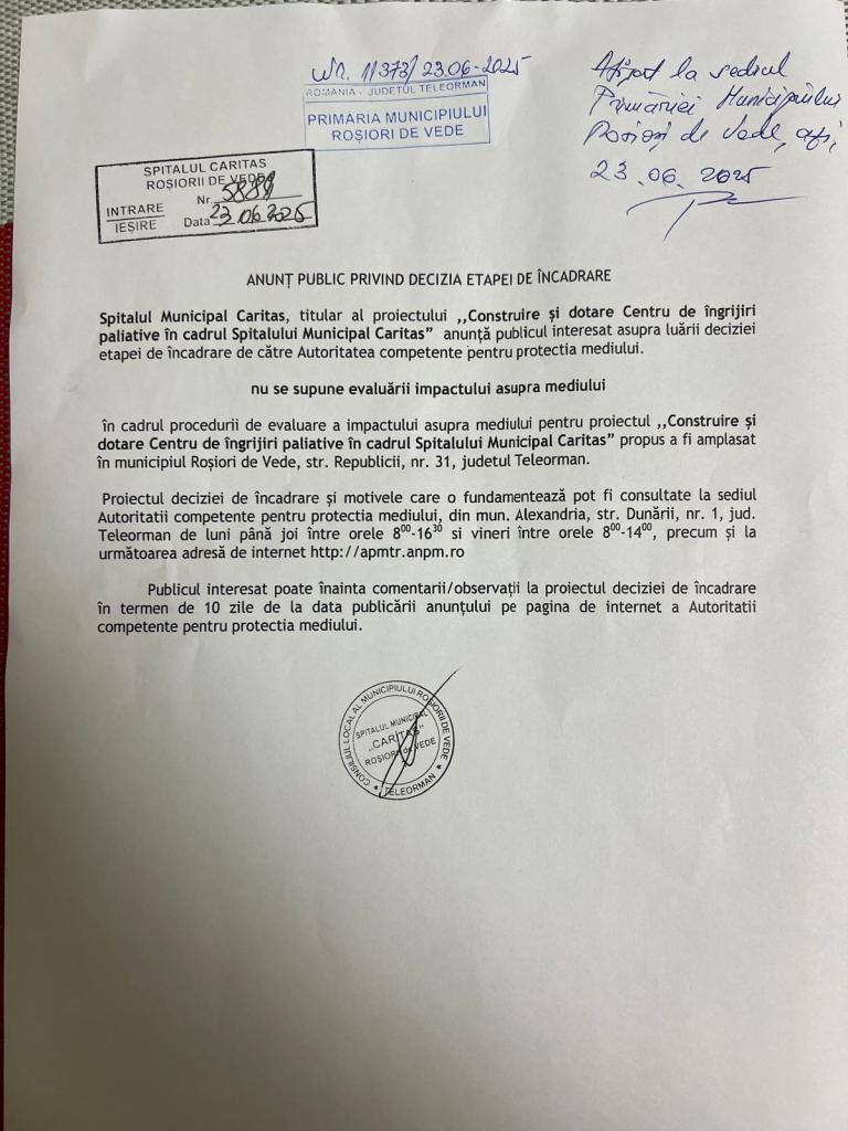 Anunț public privind decizia etapei de încadrare writeriunie 23, 2025Anunț Navigare în articole PrecedentUrmător Construire și dotare Centrul de îngrijiri paliative în cadrul Spitalului Municipal „Caritas” Partajează asta: Partajează pe X(Se deschide într-o fereastră nouă) X Partajează pe Facebook(Se deschide într-o fereastră nouă) Facebook Apreciază Încarc... Similare