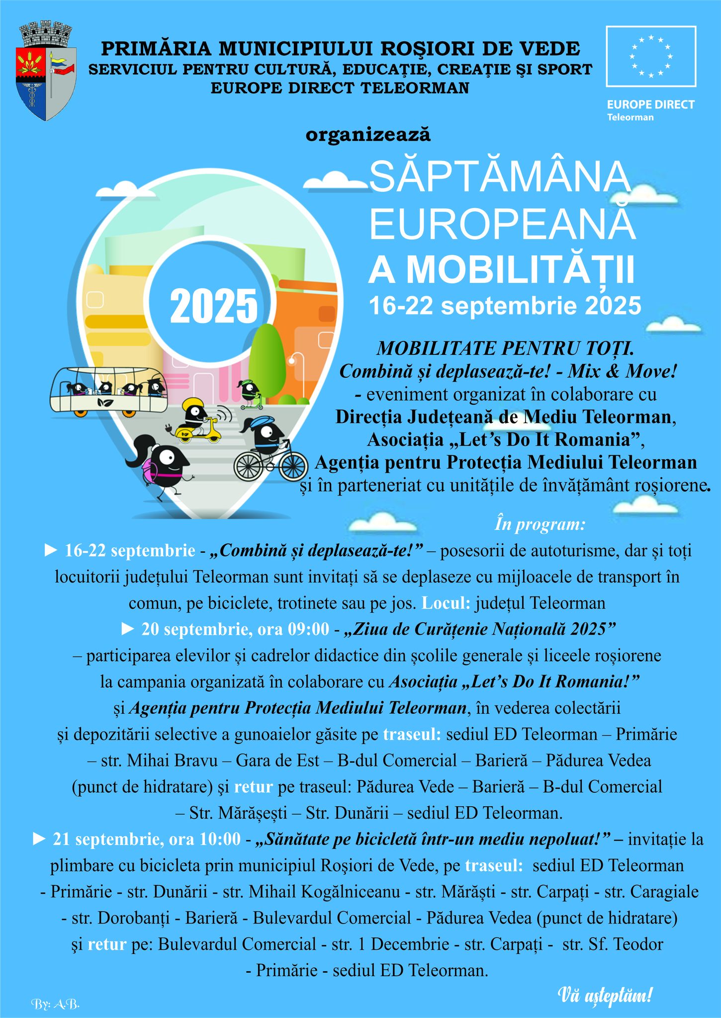 Primăria Municipiului Roșiori de Vede, Consiliul Local, Serviciul pentru Cultură, Educație, Creație și Sport, împreună cu Centrul EUROPE DIRECT Teleorman și unitățile de învățământ roșiorene, organizează o serie de evenimente dedicate Săptămânii Europene a Mobilității, campanie consacrată a Comisiei Europene care promovează mobilitatea urbană durabilă. Acțiunile se vor desfășura în perioada 16-22 septembrie 2025 și urmăresc consolidarea unui mod de viață sustenabil și responsabil, în concordanță cu obiectivele europene de protejare a mediului și de promovare a unui stil de viață activ.