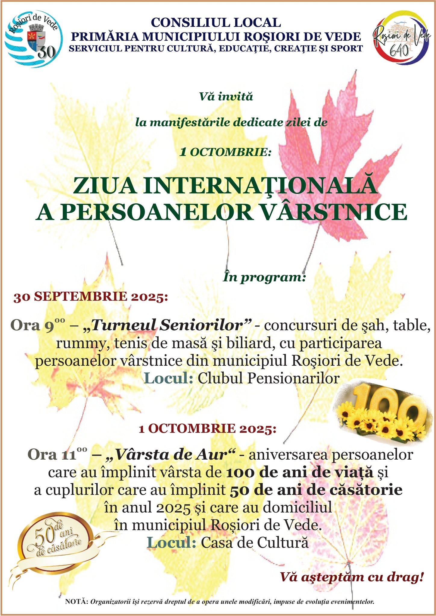 Pe 1 octombrie 2025, la Roșiori de Vede, Primăria Municipiului, prin Serviciul pentru Cultură, Educație, Creație și Sport, va organiza evenimentul „Vârsta de Aur”, dedicat Zilei Internaționale a Persoanelor Vârstnice. Evenimentul va onora seniorii care au împlinit 100 de ani și cuplurile care au aniversat 50 de ani de căsnicie.